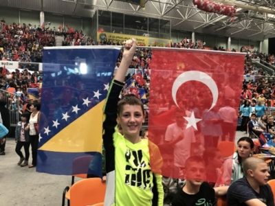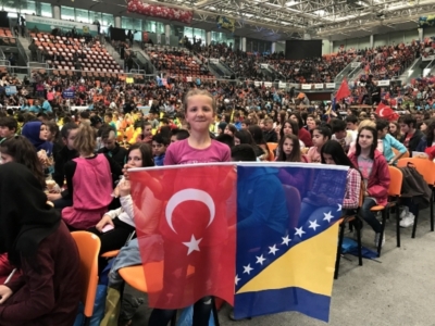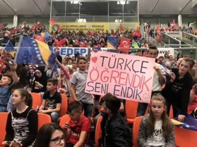 Yunus Emre Enstitüsünün “Tercihim Türkçe” projesi kapsamında Bosna Hersek’teki ilköğretim okulları ve liselerde seçmeli ders olarak Türkçe öğrenen 7.600 öğrenci Türk ve Bosna Hersek bayraklarını dalgalandırarak ecdattan gelen kardeşliği tüm Dünya’ya gösterdiler.
